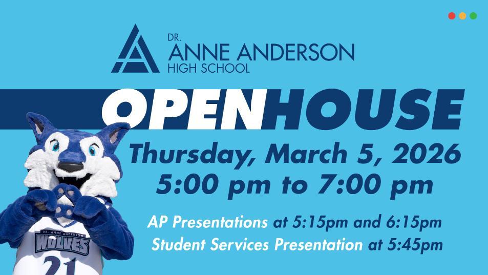 Our Open House will take place on March 5th, 2026 from 5:00 pm-7:00 pm. Join us for information about our school, courses, program offerings and more! We will have presentations for Advanced Placement (AP) programming at 5:15 pm-5:45 pm and 6:15 pm-6:45 pm, as well as presentations about our Student Services supports at 5:45 pm-6:15 pm.